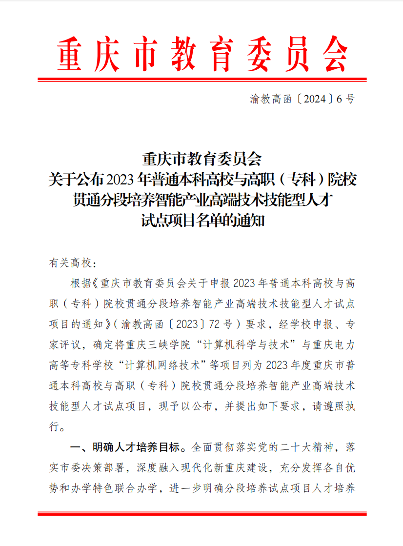 重庆市教委1月16日发出专门通知,公布 2023 年度重庆市普通本科高校与高职(专科)院校贯通分段培养智能产业高端技术技能型人才试点项目名单,我校4个专业榜上有名,成功入选,将招收265人进行专本贯通分段培养。